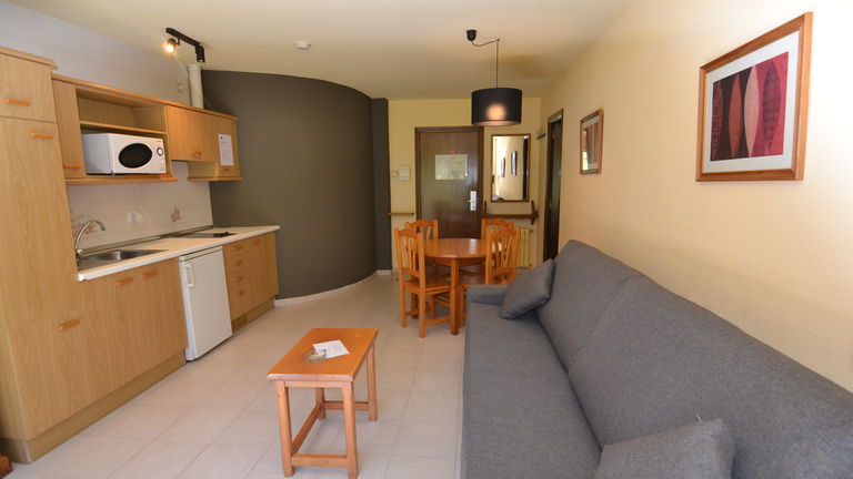 They feature a bedroom with two single beds, a living-dining room with a sofa bed for two people, and an integrated kitchen equipped with a refrigerator, microwave, ceramic hob, and basic utensils. They also include a Smart TV, heating, safe, bed linen, and towels.