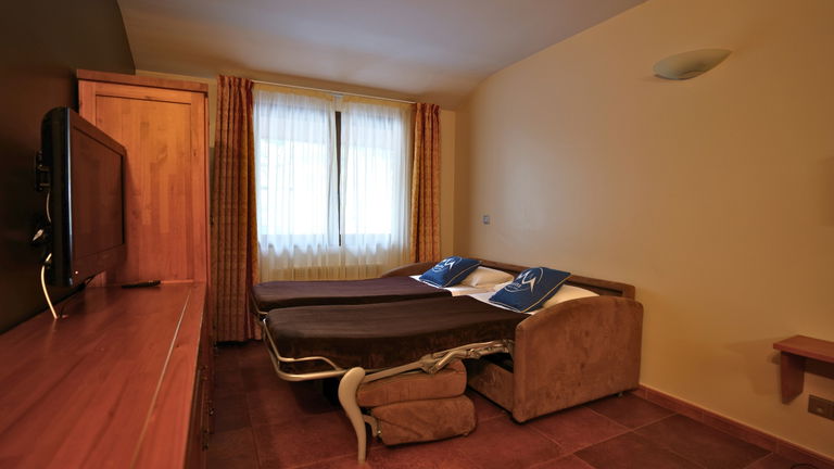 Our apartments feature a bedroom with two single beds and a sofa bed for two people in the living room. The bathroom is equipped with a shower or bathtub, and the kitchen is fully stocked with a small refrigerator, a microwave, a ceramic hob, an oven, and basic utensils. Additionally, all apartments include a Smart TV, heating, a safe, bed linen, and towels.