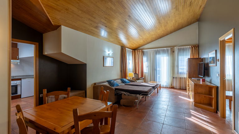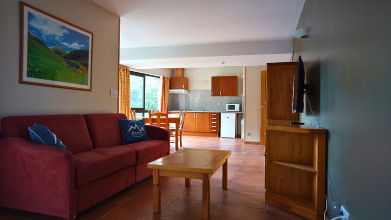 Each one has a bedroom with two single beds or a double bed, and a sofa bed for two people in the living room. The bathroom is equipped with a shower or bathtub, and the kitchen is fully stocked with a small refrigerator, a microwave, a ceramic hob, an oven, and basic utensils. All apartments include a Smart TV, heating, a safe, bed linen, and towels.